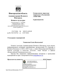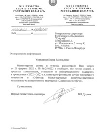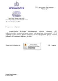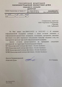 Наличие государственной поддержки при проведении мероприятия – один из ключевых показателей высокого профессионального статуса, безупречной репутации и доверия к организатору со стороны правительственных структур. С 2006 года творческое объединение «Триумф» является одним из ведущих организаторов международных конкурсов и фестивалей, арт-пленэров, образовательных семинаров, мастер-классов и тренингов. Мы гордимся тем, что наши творческие инициативы имеют поддержку на федеральном, региональном и муниципальном уровнях, а с каждым проведенным конкурсом число дружественных государственных структур растет.