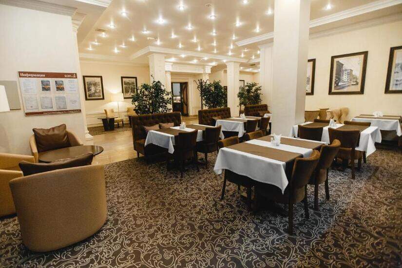 На первом этаже исторической гостиницы «Калуга» находится небольшой уютный ресторан и лобби-бар, стены которого украшают старые фотографии города. Завтраки в формате «шведский стол» сервируются в ресторане уже с 07:00, пообедать здесь можно, заказав комплексный бизнес-ланч, а на ужин выбрать блюда по меню.