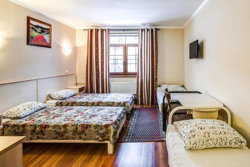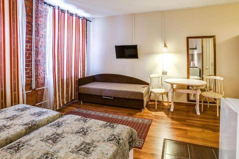 Для размещения вы можете выбрать либо номер «стандарт», либо студию. В некоторых номерах есть собственная ванная комната, постояльцы других пользуются общей. Телевизоры и холодильники есть в каждом.