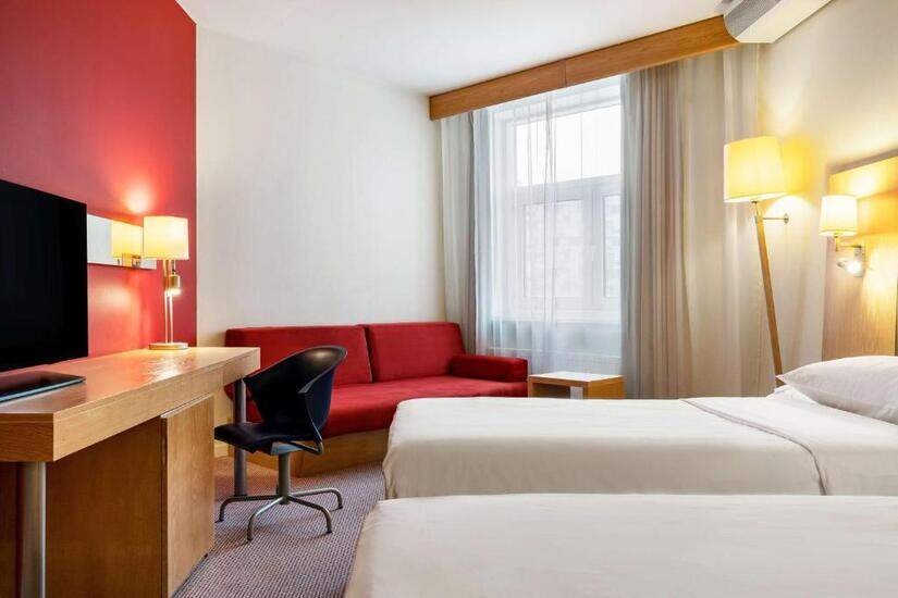 «Park Inn» держит сетевые стандарты качества. Постояльцев ждёт расширенный пакет бесплатных услуг: круглосуточный ресепшн, парковка, небольшой спортзал. В ресторане «Магеллан» гостей ждут на ранний завтрак уже с 06:00. А при бронировании, определяясь с категорией номера, вы можете выбрать по желанию либо обычный «Стандарт», либо «Стандарт» на высоком этаже (всего в здании отеля их шесть).