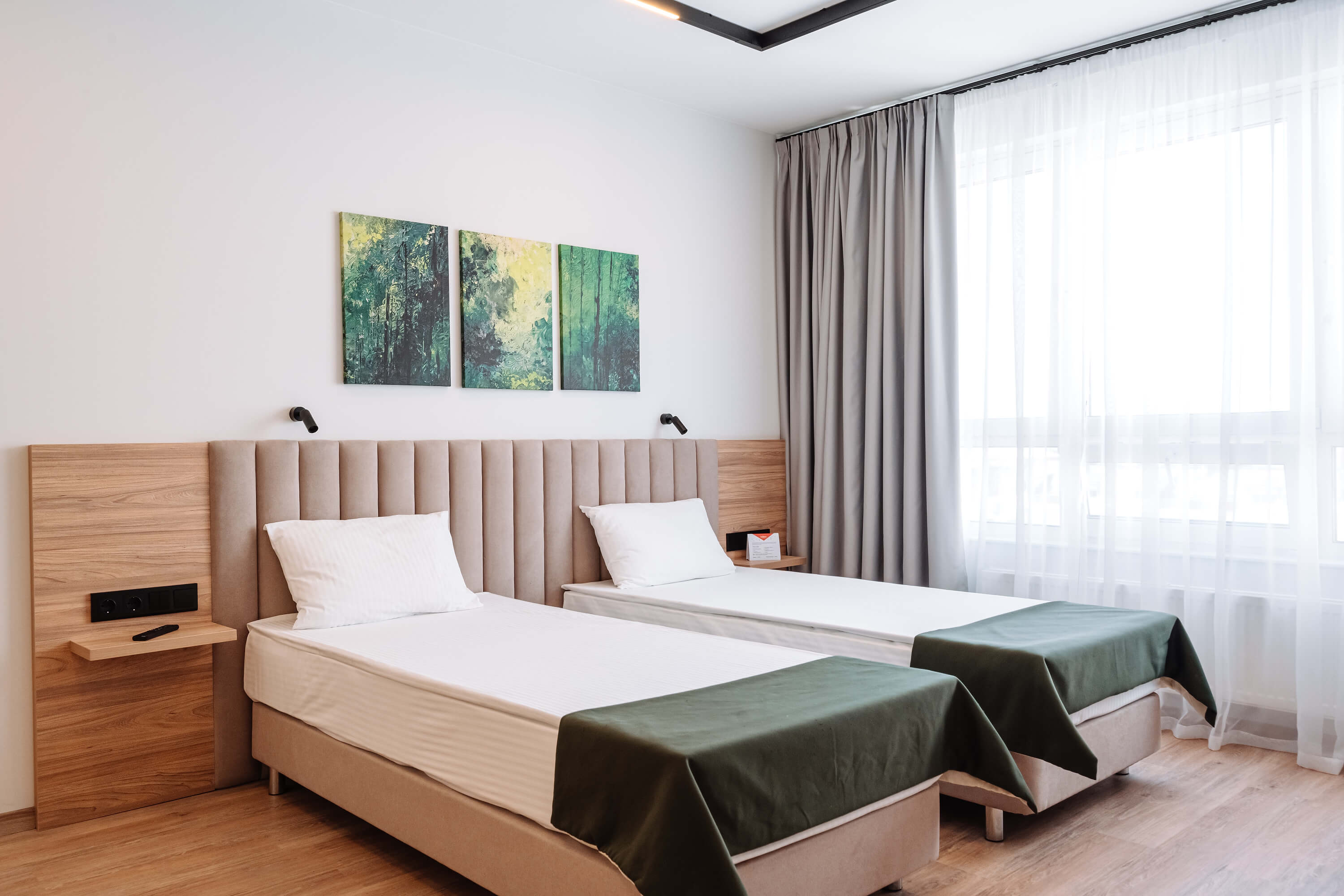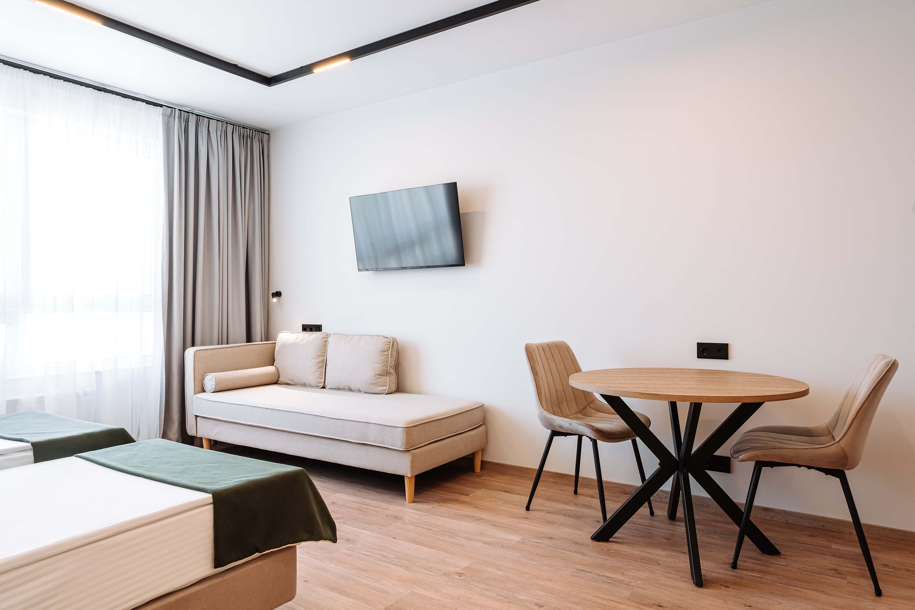 Уютные однокомнатные апартаменты Студия, площадью от 24 до 29 квадратных метров. Комфортное размещение для 2-3 гостей. В апартаментах есть все для комфортного проживания: модульные кровати, вместительный шкаф, гладильная доска с утюгом, большая ТВ-панель, рабочая зона, система кондиционирования, бесплатный Wi-Fi и индивидуальный сейф.