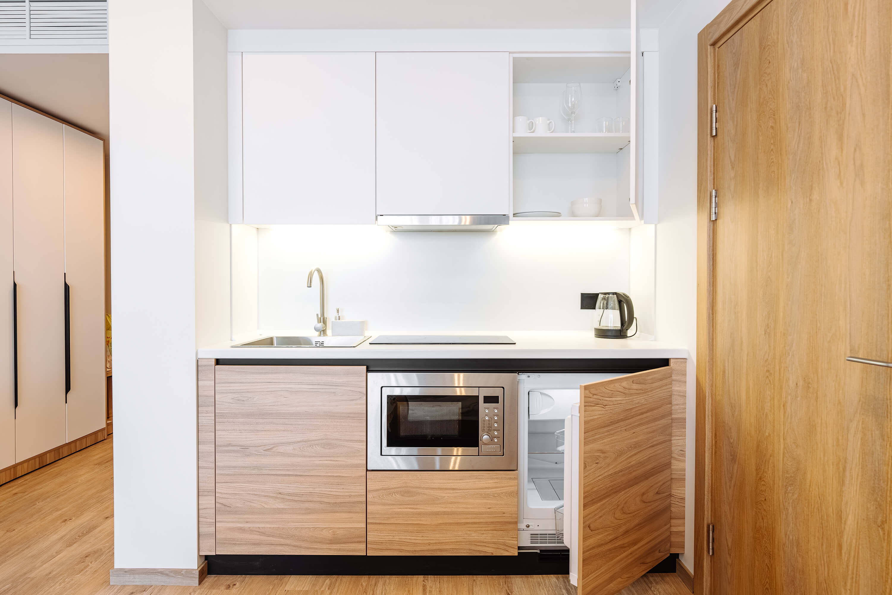 Апартаменты оснащены полноценной кухней: индукционной плитой, микроволновой печью, мини-холодильником с морозильной камерой, электрическим чайником, мощной вытяжкой, набором посуды и столовых приборов.