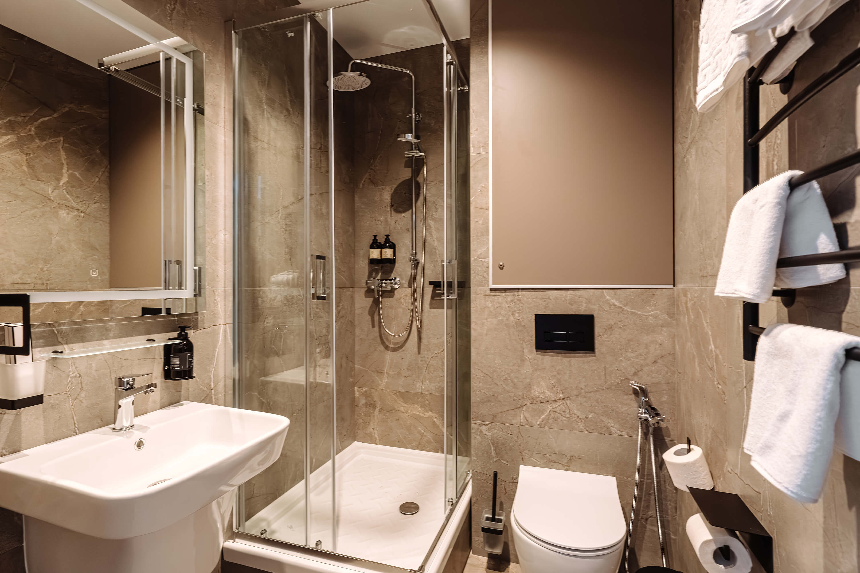 В ванной комнате - душевая зона, большое зеркало с подсветкой и феном, тёплые полы. Для гостей апартаментов подготовлены косметические средства и тапочки.