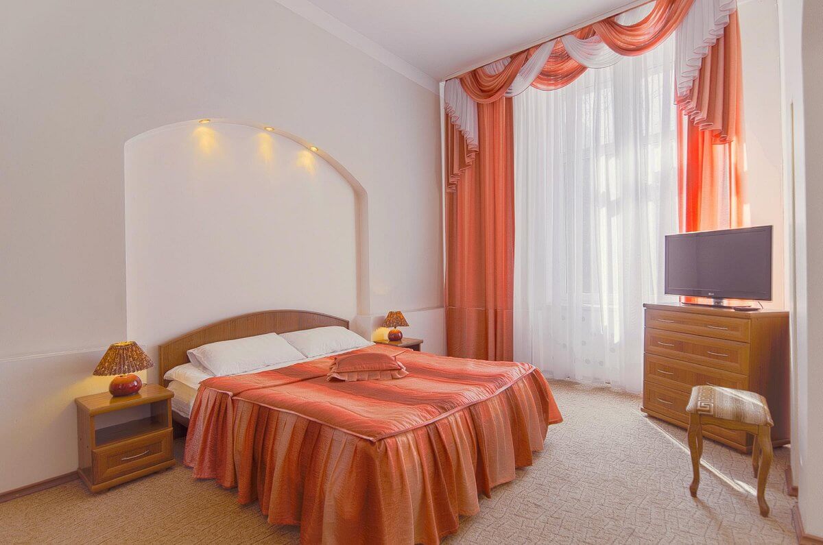 Всего в отеле более 50 номеров различных категорий – стандартов (1-2 местных), студий и люксов. Наши гости будут приятно удивлены наличием современного оборудования (ТВ, электрочайников), мягких полотенец и халатов, косметики.