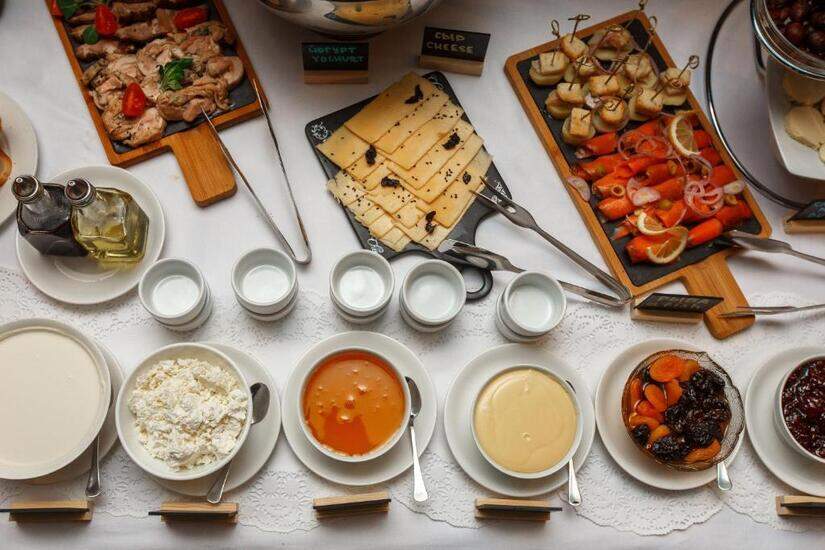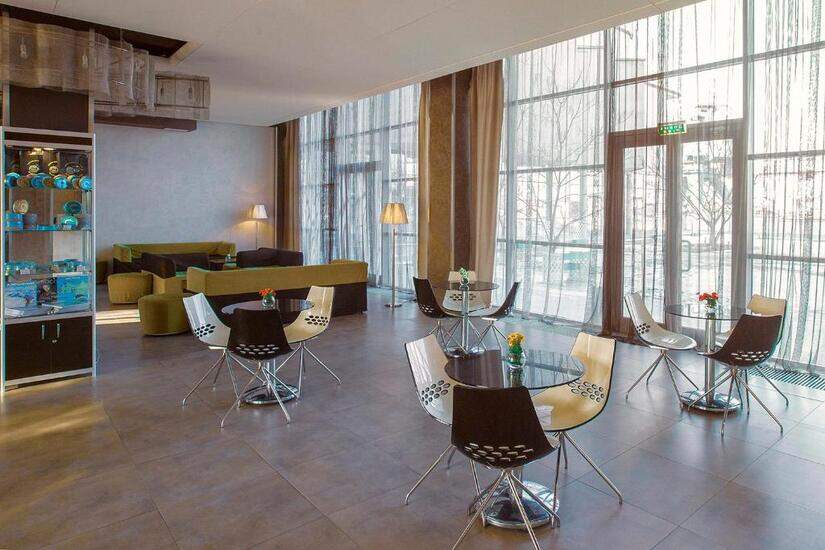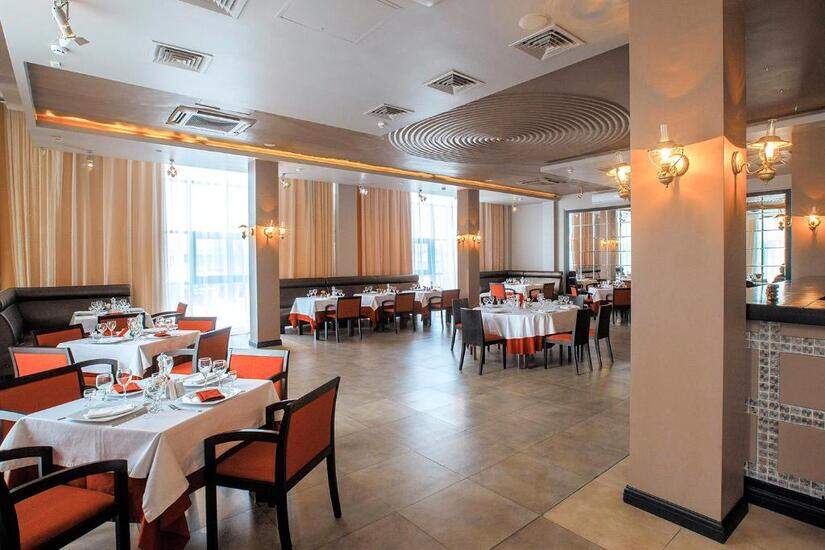 Ресторан «Волга-Волга» на первом этаже отеля предлагает постояльцам завтраки в формате «шведский стол», включённые в стоимость проживания, а также питание по меню, в котором представлены в том числе типичные для астраханской кухни блюда – многочисленные холодные закуски и кушанья из рыбы. А рядом со стойкой регистрации расположен лобби-бар, который работает круглые сутки.